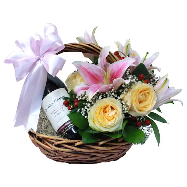 Flowers and wine gift basket. Check spelling or type a new query. We did not find results for: Maybe you would like to learn more about one of these?